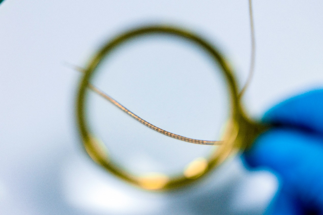 In this study, the first challenge the research team had to solve was how to layout dozens of independent electrode channels on a fiber with a diameter of about 200 microns, which is equivalent to splitting and carving dozens of fine lines of consistent length that do not cross each other on a hair strand, while ensuring the fiber is soft enough and stretchable.