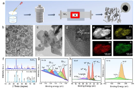 Figure 1 | Preparation and microstructure of FeWN₂. a Schematic illustration of the synthesis of nitrided nanosheets. b SEM, c TEM, and d HRTEM images.e HAADF-STEM image and corresponding elemental mapping of FeWN₂. f XRD pattern of FeWN₂ with the standard powder diffraction file. g–i XPS spectra of Fe 2p, W 4f, and N 1s.