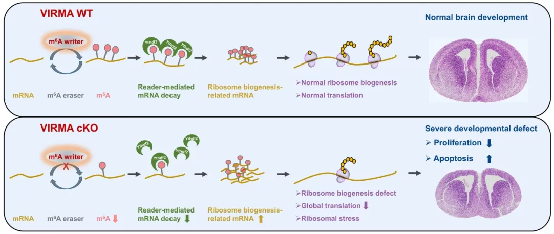 Brain development is a complex and precisely regulated process involving key steps such as proliferation and differentiation of neural stem cells. Developmental abnormalities can lead to severe neurodevelopmental disorders, such as microcephaly, bringing heavy burdens to patients, families, and society. During brain development, neural stem cell proliferation requires active ribosome biogenesis to meet the demand for massive protein synthesis. Ribosome biogenesis is a highly coordinated and energy-consuming process involving the coordinated participation of a series of ribosomal RNA (rRNA) processing factors and ribosome assembly molecules. Existing studies have shown that ribosome biogenesis defects are associated with brain developmental defects such as microcephaly, while enhanced ribosome biogenesis is closely related to cancer occurrence. Therefore, precise regulation of ribosome biogenesis is crucial for both normal development and cancer prevention. However, the RNA epigenetic regulatory mechanisms of ribosome biogenesis are currently unclear.