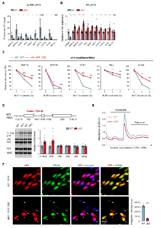 Figure 2. VIRMA Absence Triggers Ribosome Biogenesis Defects and Global Protein Translation Inhibition by Prolonging mRNA Half-Life of Key Ribosome Biogenesis Factors