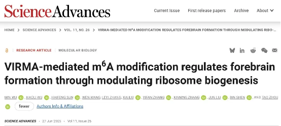 On June 27, the team led by Associate Professor Zhou Tao from the Faculty of Life and Health Sciences at Shenzhen University of Advanced Technology, together with Professor Shen Bin’s team from Nanjing Medical University, published a paper inScience Advances titled “VIRMA-mediated m6A modification regulates forebrain formation through modulating ribosome biogenesis.”The study reveals for the first time how VIRMA, the core scaffold protein of the m6A methyltransferase complex, influences brain development by regulating ribosome biogenesis.