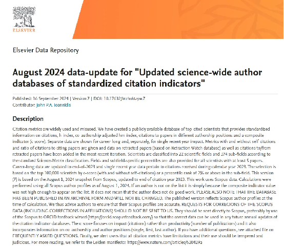 The World's Top 2% Scientists list is based on the Scopus database, selecting the top 2% of scientists worldwide from nearly 7 million scientists in two dimensions: "Career-long Scientific Impact" and "Single Recent Year Scientific Impact." The list covers 22 fields and 174 subfields, providing a metric for scientists' long-term research performance that can more objectively and truly reflect scientists' influence. Among them, the career-long scientific impact list statistics the comprehensive performance during scientists' careers, while the single recent year scientific impact list focuses more on academic influence in the previous year. Being selected for the list means the scholar has high global influence in their research field.