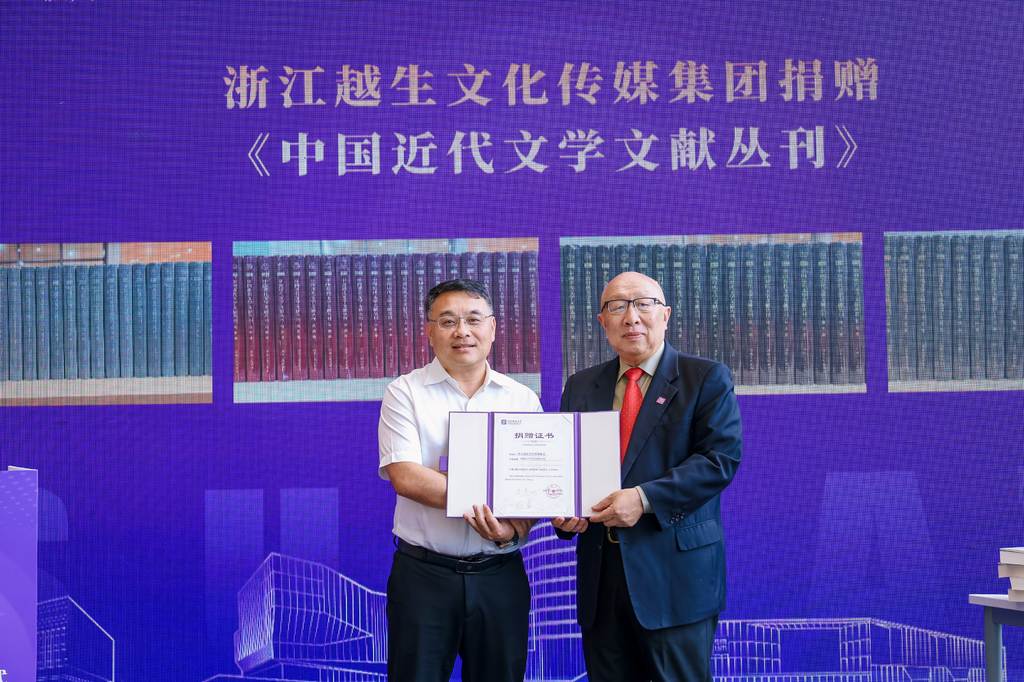 浙江越生文化传媒集团总经理李相银介绍其赠品:《中国近代文学文献丛刊》。赵伟代表学校接受捐赠,并向其授予荣誉证书。