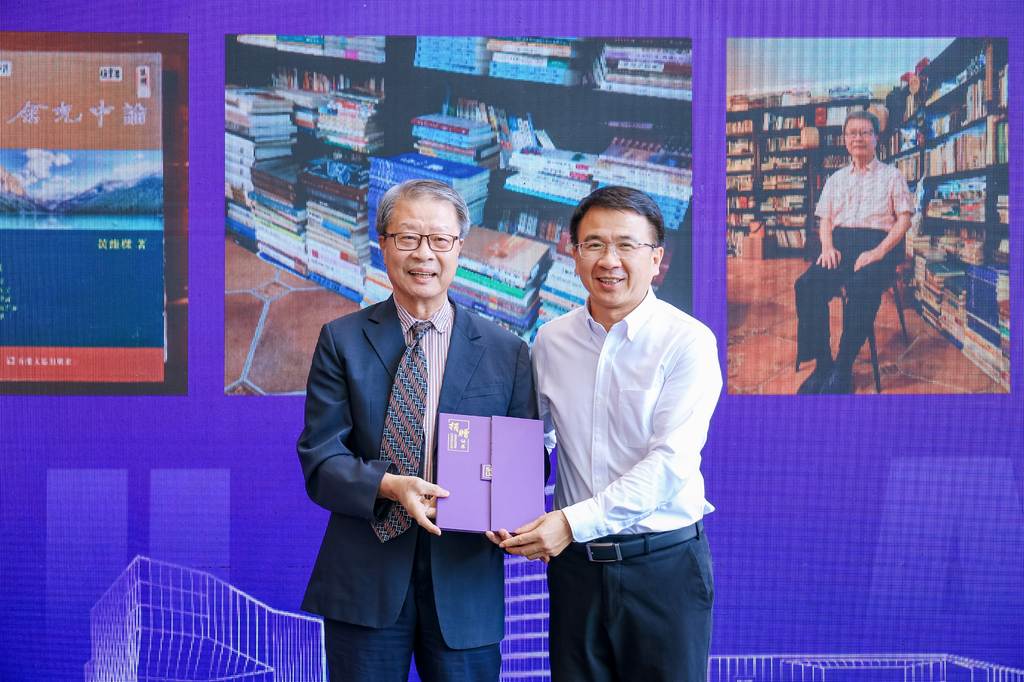 香港中文大学原教授黄维梁对其个人捐赠的5000余册围绕文学和人文主题的丛书进行了简要介绍。吴志伟代表深圳理工大学接受捐赠,并向其授予荣誉证书。
