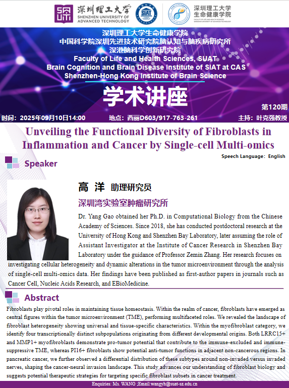 生命健康学院第120期学术讲座《Unveiling the Functional Diversity of Fibroblasts in Inflammation and Cancer by Single-cell Multi-omics 》