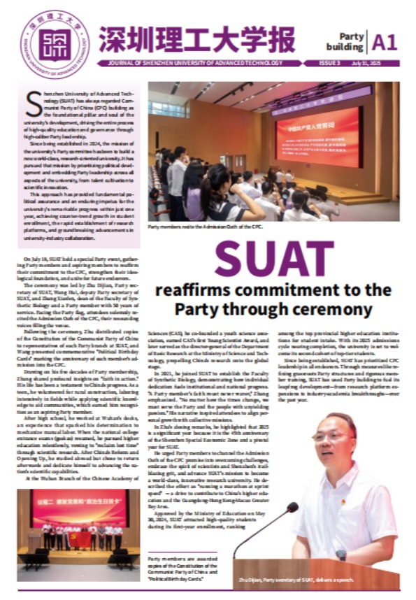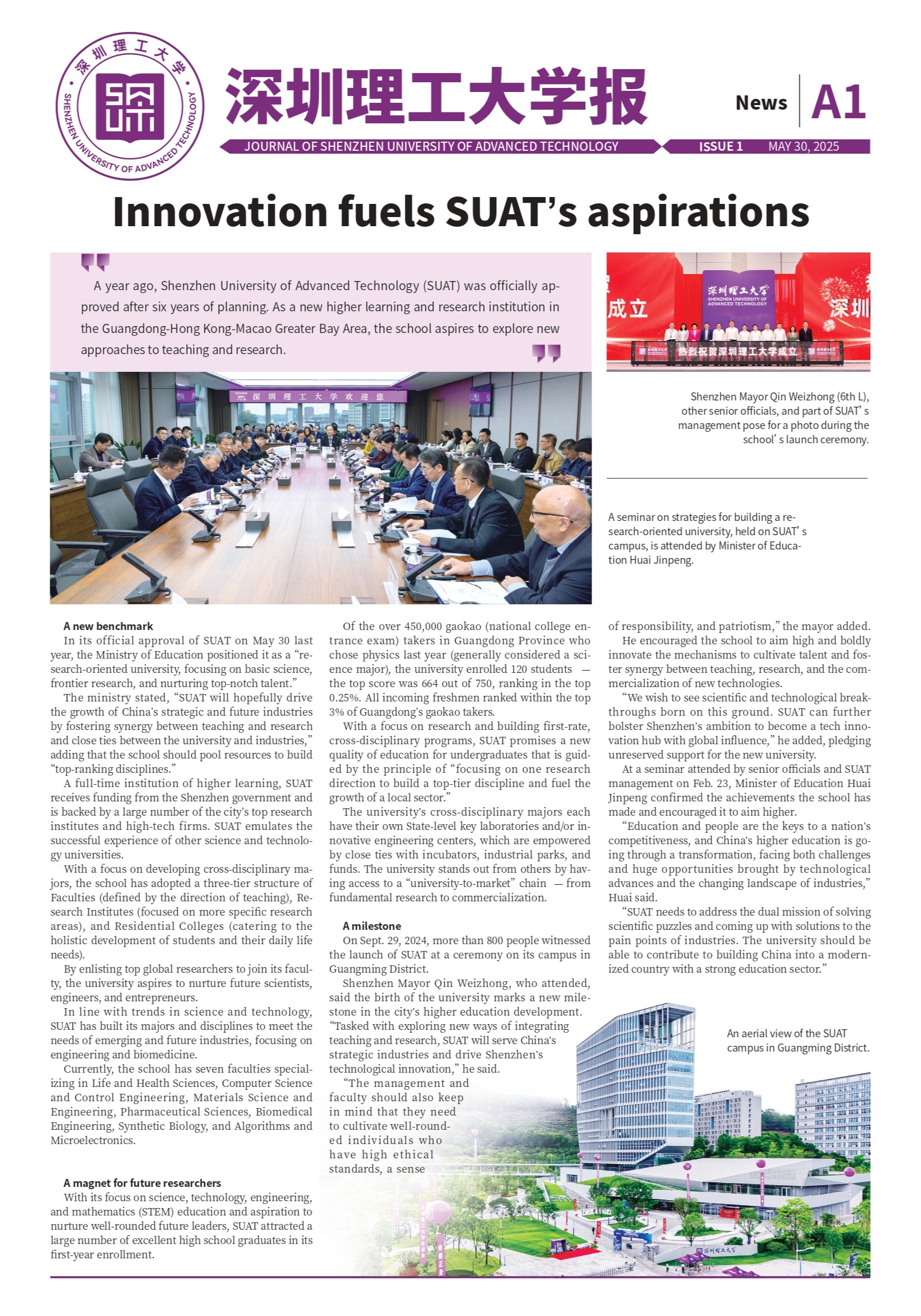 Shenzhen University of Advanced Technology (SUAT) is a full-time higher education institution with legal status, established by the Shenzhen Municipal Government. In May 2024, approved by the Ministry of Education, SUAT was established as a new research university, characterized by a high starting point, research orientation, compact scale, and global openness, focusing on fundamental and cutting-edge scientific research and cultivating top innovative talent. Drawing on the models of world-class science and technology universities, SUAT leverages the rich resources of top-tier research institutions like the Shenzhen Institutes of Advanced Technology (SIAT) to build a high-standard, high-quality university. With a focus on integrating industry and education, fostering interdisciplinary programs, and cultivating talent through the "Three Academies as One" model, SUAT promotes the synergistic development of education, technology, and talent, recruiting high-caliber global faculty and nurturing outstanding scientists, exceptional engineers, and innovative entrepreneurs through tailored education.