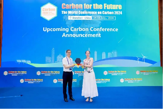 At the closing ceremony of the World Conference on Carbon 2024, Academician Cheng Huiming handed over the conference commemorative monument to Nathalie Job, President of the European Carbon Association and Chair of the 2025 World Conference on Carbon. The World Conference on Carbon in 2025 and 2026 will be held in Saint-Malo, France, and Charleston, USA, respectively.