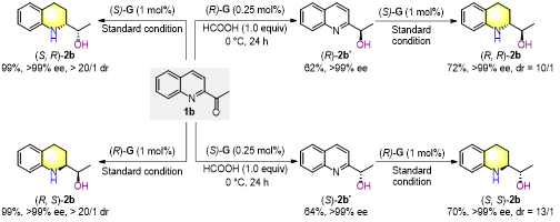Mechanistic studies confirmed a cascade pathway of “carbonyl first, then quinoline skeleton,” with stereochemistry controlled by the catalyst at each step. Crucially, controlling temperature and reductant amount allows controllable synthesis of chiral alcohol intermediates, and switching catalyst configuration enables access toall four stereoisomers of the tetrahydroquinoline products.