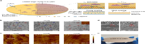 Crucially, wrinkle formation on the growth substrate occurs in two steps: local hBN detachment forming small wrinkles, followed by sliding of detached hBN to enlarge wrinkles. Enhanced friction and binding energy suppress both steps (as shown in Figure 2), enabling ultra-flat single-crystal hBN wafers. Subsequently, uniform ultra-thin HfO₂ layers were deposited via ALD on 4-inch ultra-flat hBN wafers. The hBN/HfO₂ stack exhibited excellent dielectric performance, a low equivalent oxide thickness (EOT) of 0.52 nm, and low leakage current (2.36 × 10⁻⁶ A cm⁻²).