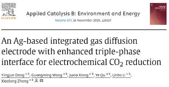 Recently,the team led by Assistant Professor Zhang Xiaolong (Faculty of Materials Science and Energy Engineering, Shenzhen University of Advanced Technology)published a paper titled“Ag-based integrated gas diffusion electrode with enhanced three-phase interface for electrochemical CO₂ reduction” inApplied Catalysis B: Environment and Energy.