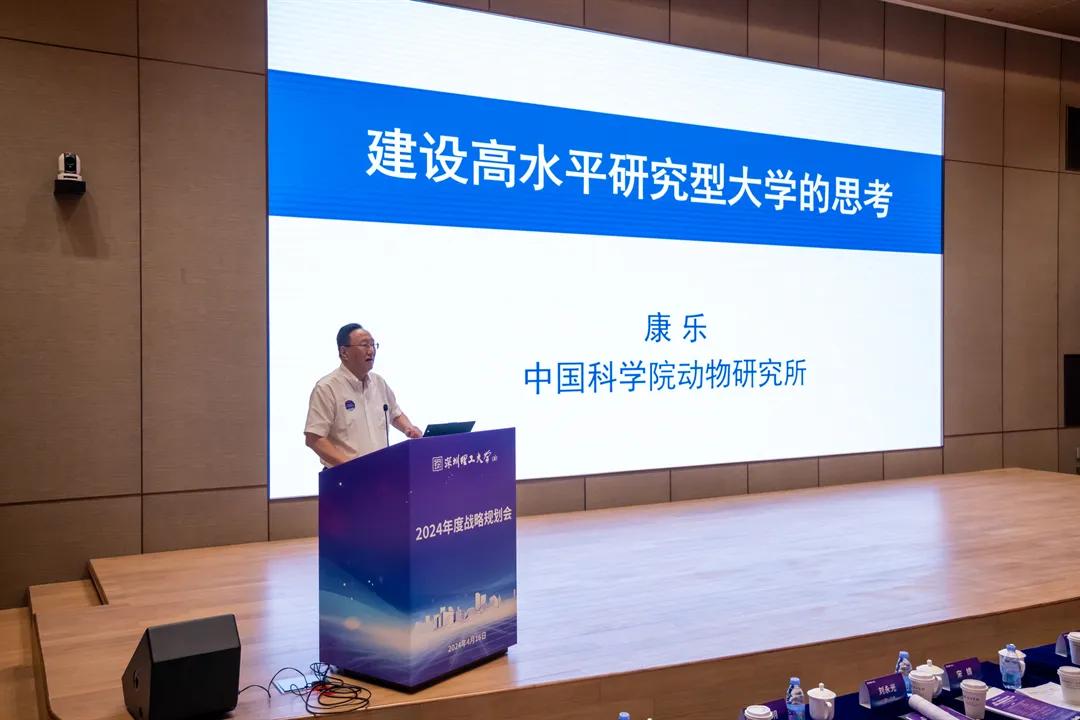 深理工筹备办主任、中国科学院深圳先进技术研究院创院院长樊建平以“深圳理工大学五年发展规划与2024年主要任务”为题展开主题汇报。樊建平详细阐述了深理工六年来的建设心得和未来发展规划。他指出,深理工是在全球科技大爆发、各国比拼发展新质生产力决胜未来的大背景下设立和发展的,以深理工为代表的新型研究型大学已然成为推动科技创新、引领教育变革和培养创新型人才的重要基地。回顾过往,樊建平介绍道,作为广东省“十四五”期间重点新建的全日制普通本科高校,深理工坚持“高起点、高水平、高标准、高质量”建设,与中国科学院深圳先进技术研究院紧密合作,已经形成了“产教融合、科教融汇”的办学特色。筹建六年来,深理工深度对接大湾区战略性新兴产业和未来产业的发展需求,聚焦“新工科”“新医科”,围绕新兴前沿交叉学科布局七大学院;借力深圳市和中国科学院的人才政策,快速组建了一支高水平且具有国际化视野的教师队伍;创建了“三院一体”的精英本科人才培养体系,构建了“基础-专业-创新”梯次推进的分轨培养模式,致力于依托高水平科研机构的科教、产教基础实现“建一个学院、成一流学科、强一片产业”的愿景。