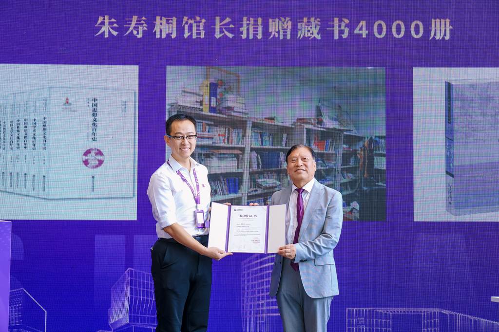 朱寿桐对其个人捐赠的4000余册研究地方文化与历史的丛书进行了简要介绍。张晓代表学校接受捐赠,并向其授予荣誉证书。