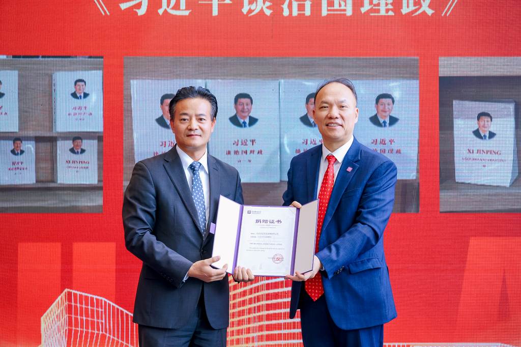 北京崇学文化发展有限公司总经理余富文介绍其赠品:系列文献《习近平谈治国理政》。朱迪俭代表学校接受捐赠,并向其授予荣誉证书。