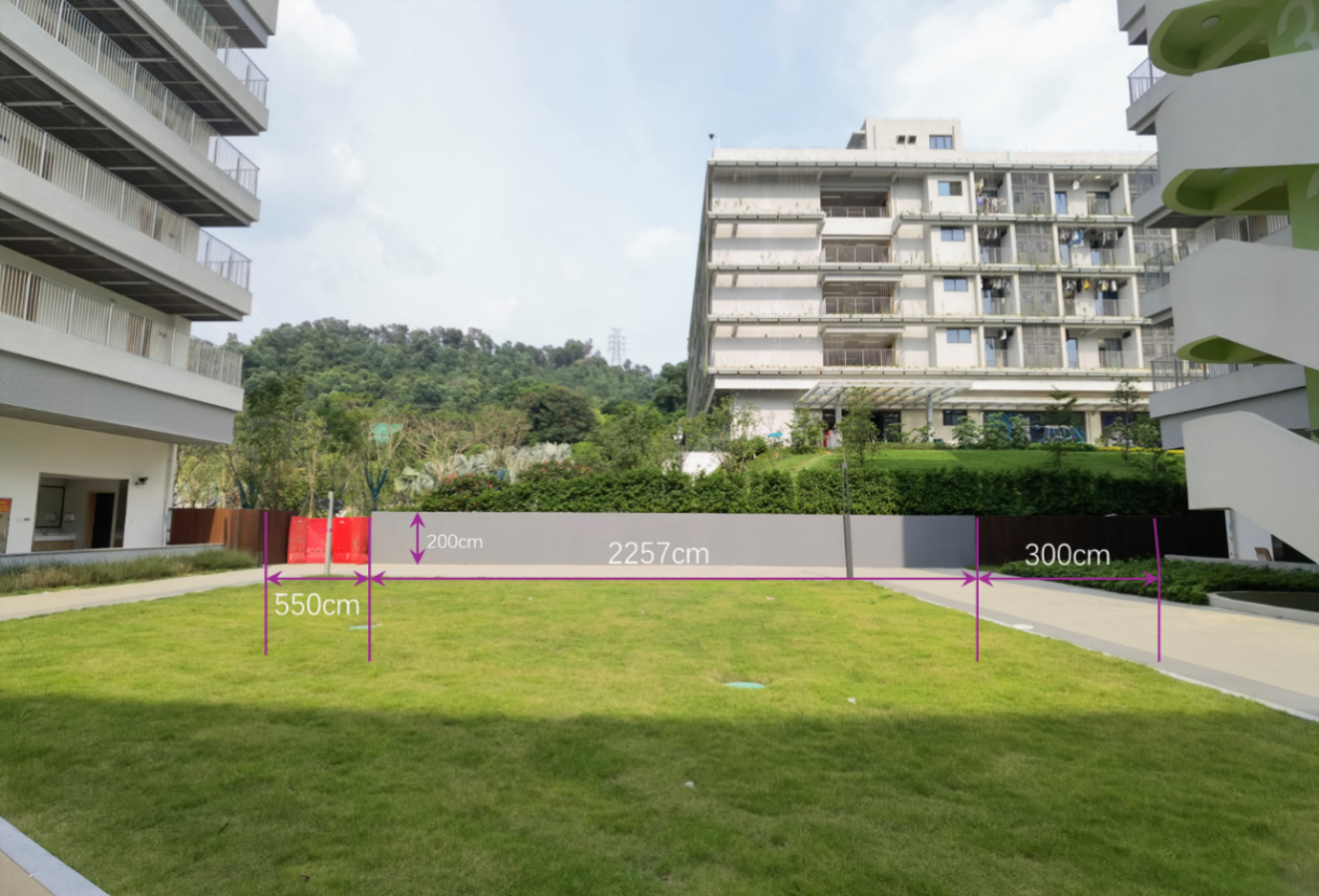 (三)作品设立位置计划为深圳理工大学主校区天权4号楼书院中庭,摆放位置、安装方式不限,但原则上应坐落在书院中庭范围内。参赛者可根据作品需要对现场环境进行适当改造(例如,拆除或填补现有墙体和两边围挡)。作品拟设立场地实景见下图。因拍摄角度问题,图中标注尺寸可能存在误差。